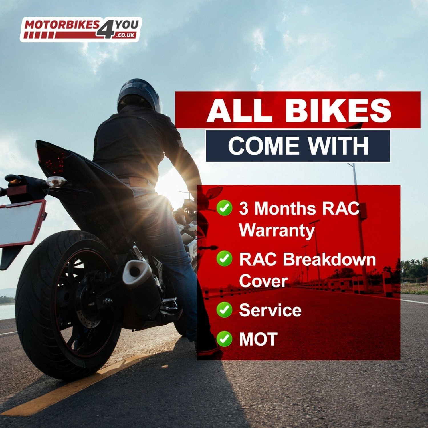 For peace of mind, every bike comes with a warranty, an HPI check, full valet, a minimum of six months MOT, a full mechanical check before delivery, and we’ll service the bike where